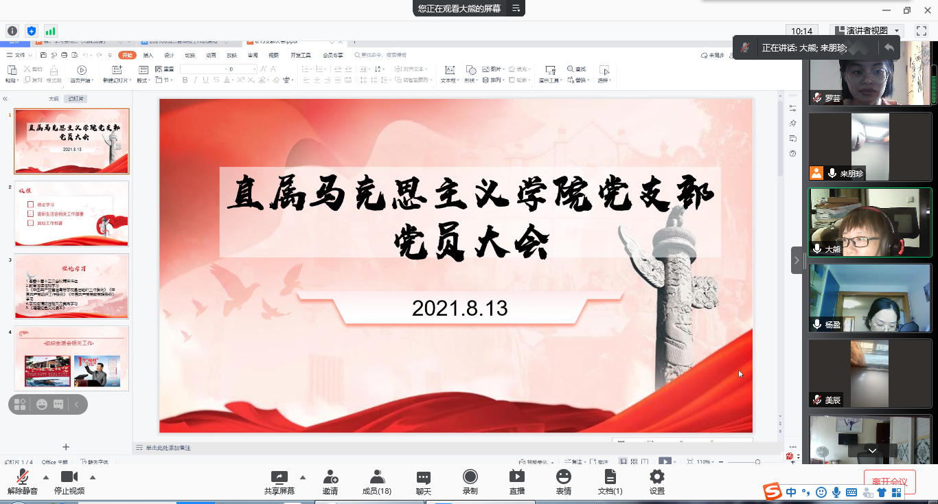 2021年8月13日上午,直屬馬克思主義學(xué)院黨支部全體黨員齊聚“云端”開展線上理論學(xué)習(xí),活動(dòng)由黨支部書記熊美蘭主持。