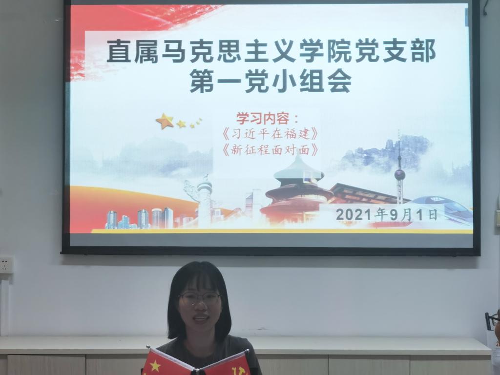 2021年9月1日,直屬馬克思主義學(xué)院黨支部第一黨小組在行政樓107開(kāi)展理論學(xué)習(xí),學(xué)習(xí)《習(xí)近平在福建》《新征程面對(duì)面》,會(huì)議由宣傳委員羅蕓主持。