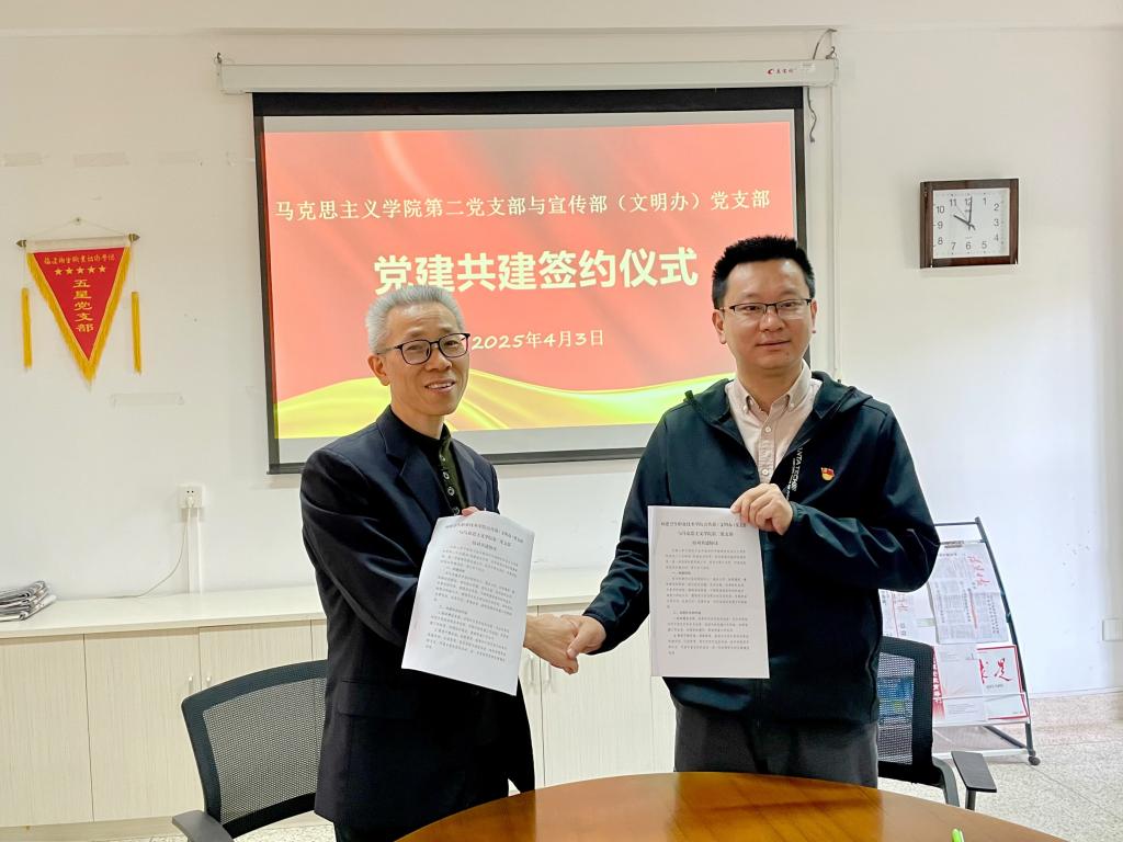 為充分發(fā)揮基層黨支部戰(zhàn)斗堡壘作用,推動學(xué)校機關(guān)黨建與學(xué)院黨建在落實立德樹人根本任務(wù)上的深度融合,2025年4月3日,馬克思主義第二黨支部與宣傳部(文明辦)黨支部在厚德樓107舉行黨建共建簽約儀式,并聯(lián)合開展“緬懷革命先烈,傳承紅色基因”主題黨日活動?;顒佑神R克思主義學(xué)院第二黨支部書記胡濟林主持,馬克思主義學(xué)院第二黨支部、宣傳部(文明辦)黨支部全體黨員參加共建活動。