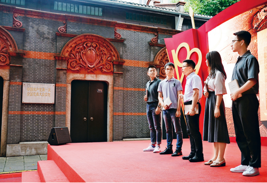 2020年6月29日,“新時代答卷人——上海市教育系統(tǒng)慶祝中國共產黨成立99周年暨學生愛國主義教育主題活動”在中共一大會址前舉行。來自復旦大學、同濟大學、上海建橋學院、上海市曹楊第二中學等8所學校的200余名師生代表參加活動,通過情景講述、現場教學、集體朗誦等形式,慶祝中國共產黨成立99周年,展現廣大上海學子的愛國情、強國志。圖為復旦大學師生代表在一大會址前展示情景教學。(新華社記者 劉穎/攝)