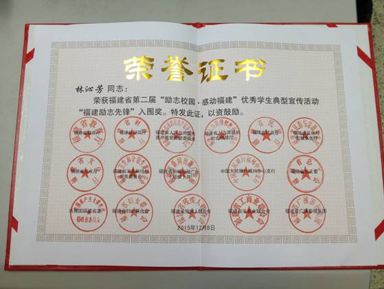 我院學(xué)生榮獲福建省第二屆“勵(lì)志校園.感動(dòng)福建”優(yōu)秀學(xué)生典型宣傳活動(dòng)“福建勵(lì)志先鋒”入圍獎(jiǎng)