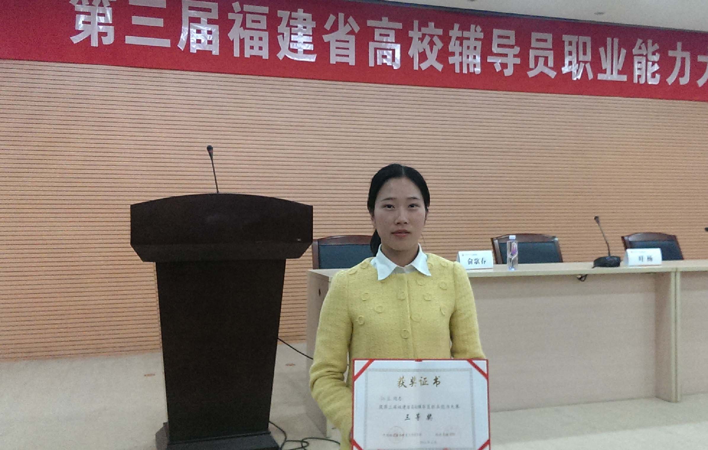 2014年4月2日~3日第三屆福建省高校輔導(dǎo)員職業(yè)能力大賽在福建師范大學(xué)旗山校區(qū)舉行。我院楊盈老師參賽,經(jīng)過緊張激烈的復(fù)賽、決賽,喜獲三等獎。