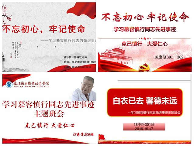我校全體輔導(dǎo)員在10月17日參加學(xué)院隆重舉行的“不忘初心、牢記使命”主題教育之身邊先進(jìn)典型學(xué)習(xí)活動(dòng)——慕容慎行同志先進(jìn)事跡報(bào)告會(huì)后,受慕容慎行同志作為人民好醫(yī)生、人民好教師的崇高品格和精神風(fēng)貌所感染,及時(shí)積極將學(xué)習(xí)精神通過(guò)開(kāi)展學(xué)習(xí)慕容慎行先進(jìn)事跡主題班會(huì)的形式傳達(dá)給學(xué)生們。在10月20日晚的輔導(dǎo)員班會(huì)課上,輔導(dǎo)員們備上報(bào)告會(huì)錄像資料和各自認(rèn)真準(zhǔn)備的PPT等班會(huì)資料,為學(xué)生們傳達(dá)“慕容”精神。