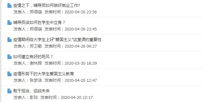 學習過程中,輔導員們還圍繞“如何做好疫情期間青年學生的愛國主義教育”“如何建立良好的班風”“疫情期間如何繼續(xù)提升大學生職業(yè)競爭力”等主題積極開展網絡集中研討,學習交流同分享,攜手同行共成長。