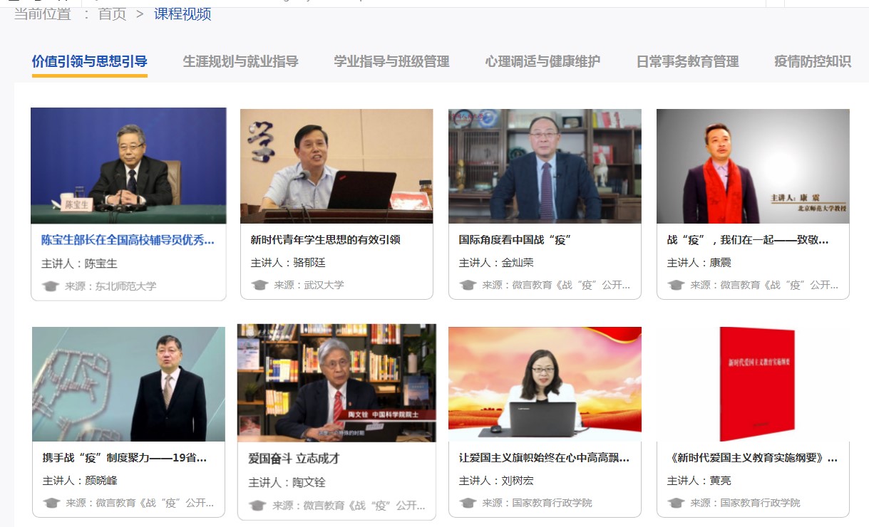 本次培訓活動分為課程學習、主題研討、心得撰寫、直播答疑等四個環(huán)節(jié),課程涵蓋“價值引領與思想引導”“生涯規(guī)劃與就業(yè)指導”“學業(yè)指導與班級管理”“日常事務教育管理”“心理調適與健康維護”“疫情防控知識”六大模塊,課程體系全。