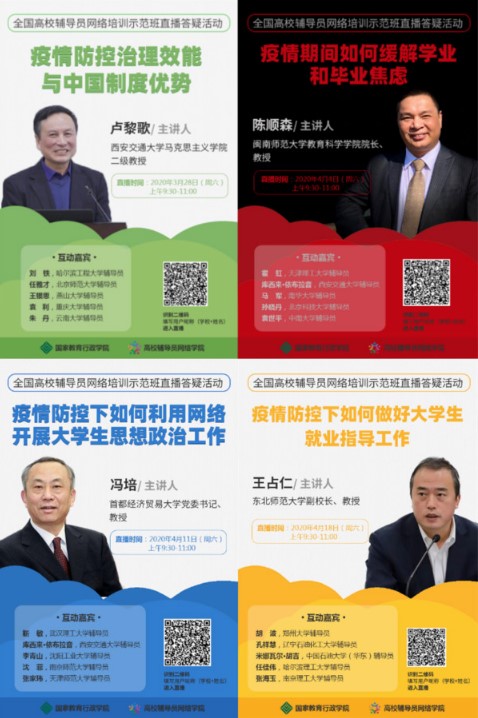 同時結合每周一次的直播課形式,緊密貼合疫情當下青年學生的思想政治工作、學業(yè)就業(yè)指導等主題設置,搭建起思政工作領域專家、全國高校輔導員年度人物與輔導員交流研討的平臺,有力促進學員相互學習共同成長。