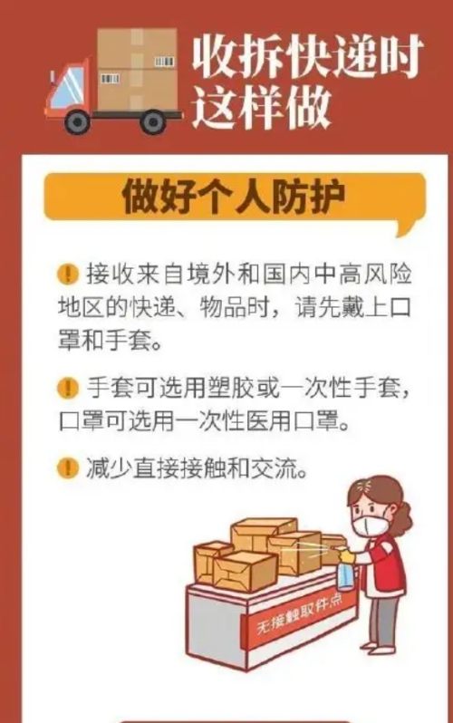 減少不必要網(wǎng)購(gòu),特別是不從中高風(fēng)險(xiǎn)區(qū)與國(guó)(境)外購(gòu)物。在接收快遞時(shí),應(yīng)全程佩戴口罩,建議先對(duì)外包裝進(jìn)行消毒,或者放置在通風(fēng)有陽光處?kù)o置一段時(shí)間后再開包使用,拆包后的垃圾應(yīng)按垃圾分類處理。處理完畢后,清洗消毒雙手。如接收到涉疫快遞,應(yīng)主動(dòng)報(bào)告輔導(dǎo)員,并配合排查工作。
