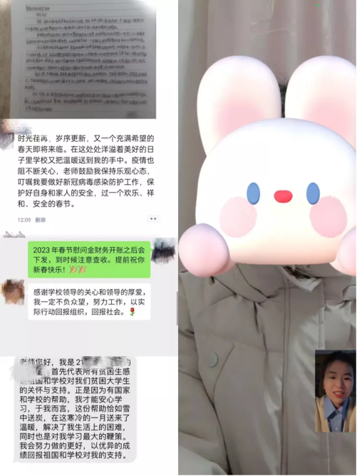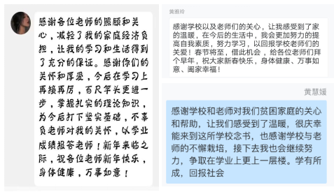 慰問結(jié)束后,同學(xué)們紛紛發(fā)來感謝短信,感激國(guó)家資助政策的支持,感謝學(xué)校和老師的溫暖關(guān)懷,表示未來將再接再厲、踔厲奮發(fā)、學(xué)有所成,報(bào)答學(xué)校和老師的殷切栽培,并向老師們送上了新春祝福。