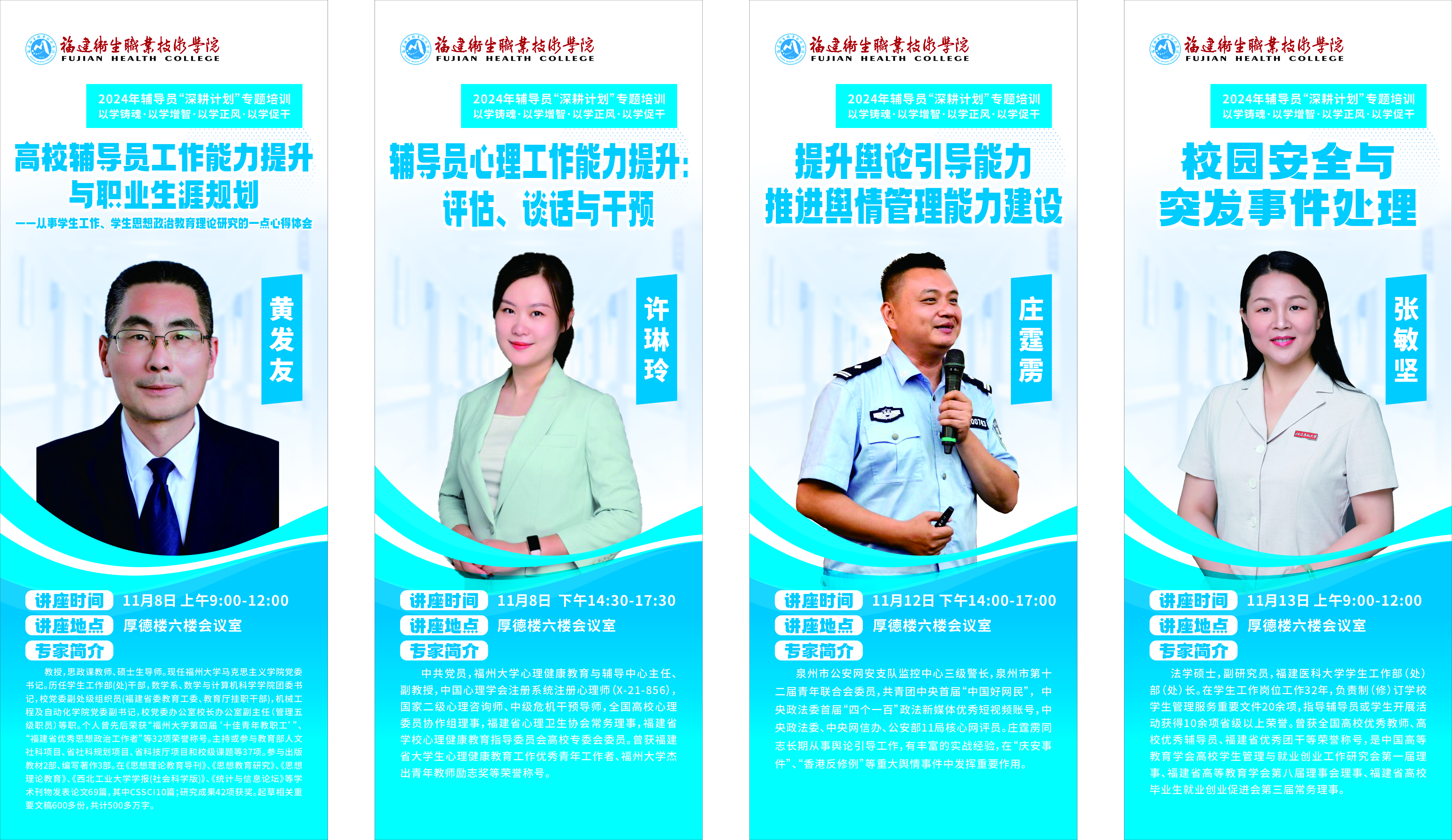 此次培訓(xùn)為期三天,分別邀請(qǐng)來(lái)自福州大學(xué)、福建醫(yī)科大學(xué)、泉州公安網(wǎng)安支隊(duì)等單位的專家前來(lái)授課,就輔導(dǎo)員職業(yè)生涯規(guī)劃、心理工作能力、輿論引導(dǎo)能力、校園突發(fā)事件處理能力等專題內(nèi)容進(jìn)行講授。