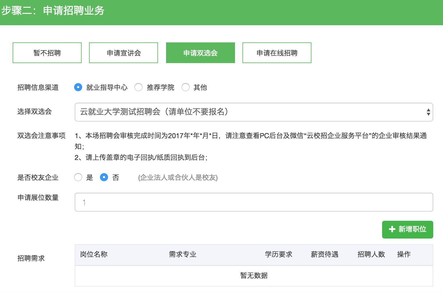 3.填完之后,點擊“下一步”,在“申請類型”中點擊“雙選會”,填寫參會資料,點擊“申請”。