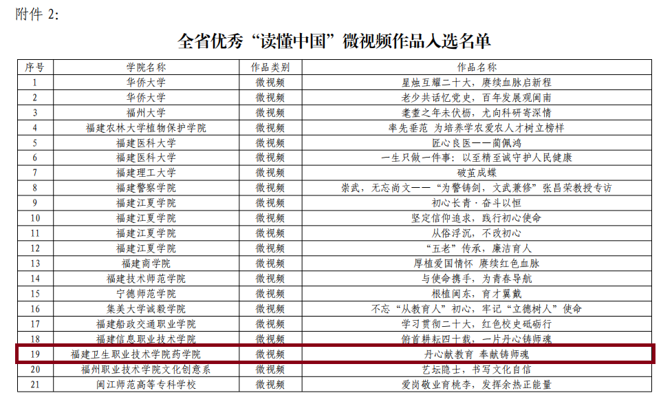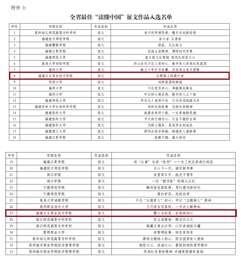近日,福建省教育廳關工委通報2023年“讀懂中國”活動作品評審結果,我校關工委獲全國優(yōu)秀組織獎,我校選送的《丹心獻教育奉獻鑄師魂》獲評全省優(yōu)秀微視頻作品,《志愿路上的提燈者》及《警心永向黨,余熱映初心》獲評全省最佳征文作品,《捧出一顆丹心,獻與億兆生靈》《初心在磐,使命在肩》及《勞模精神不褪色,鼓蕩丹心永綿延》獲評全省優(yōu)秀征文作品。