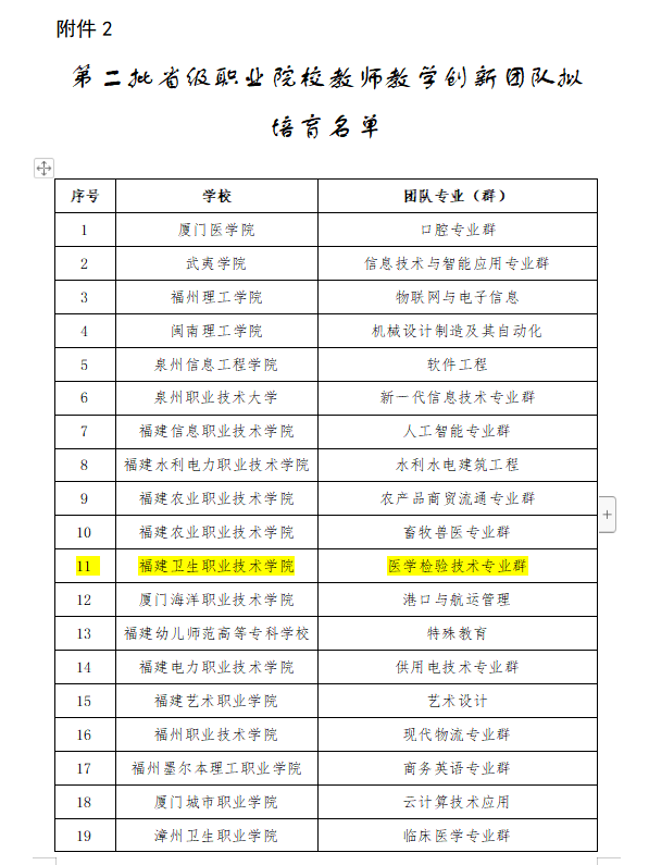 經(jīng)福建省教育廳評審,“醫(yī)學(xué)檢驗技術(shù)專業(yè)群教師創(chuàng)新團(tuán)隊”入選第二批省級職業(yè)院校教師教學(xué)創(chuàng)新團(tuán)隊培育名單。