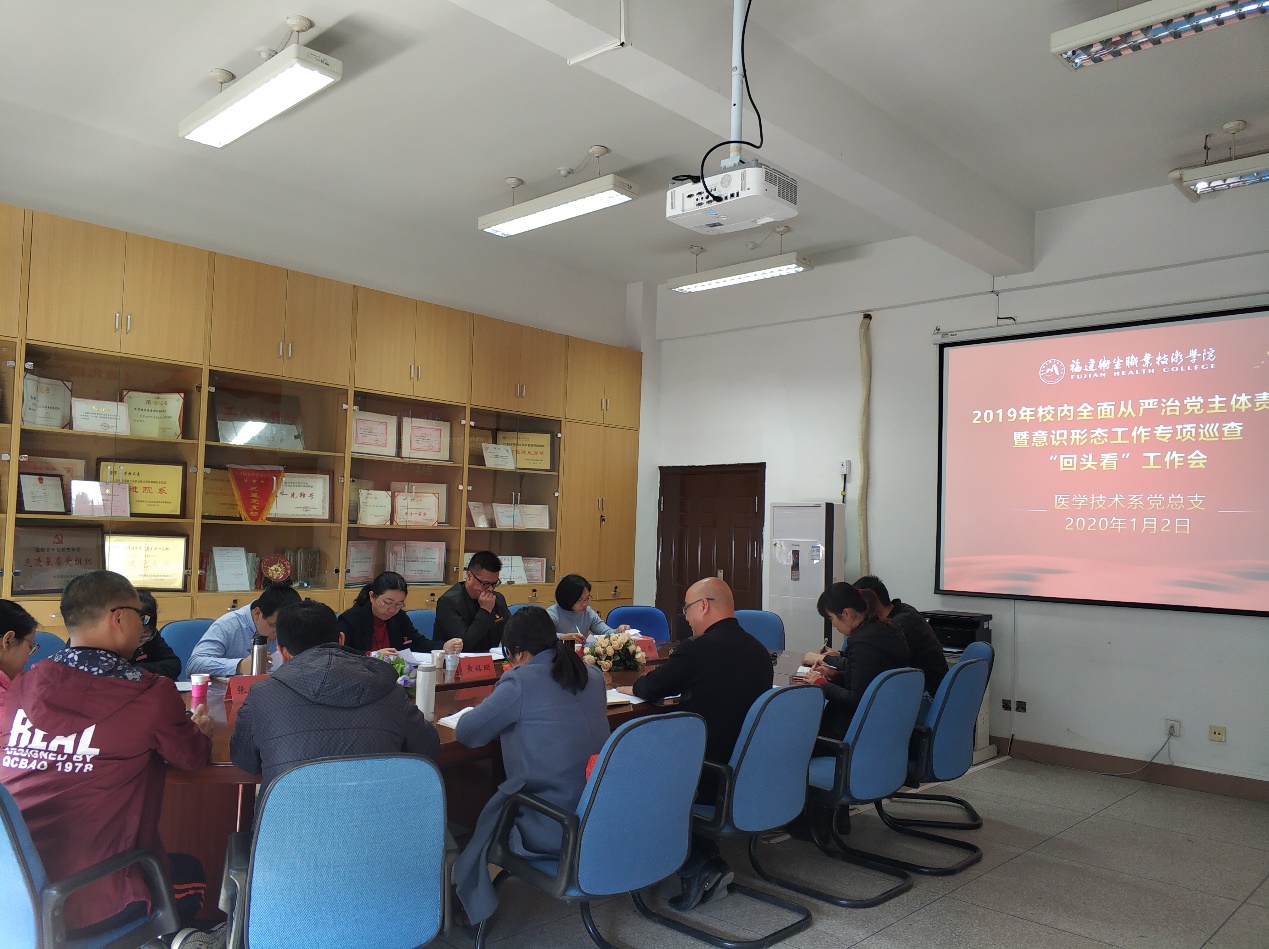 醫(yī)學(xué)技術(shù)系黨總支于系部會議室召開2019年全面從嚴(yán)治黨主體責(zé)任暨意識形態(tài)工作專項巡查“回頭看”匯報會,會議由系黨總支負(fù)責(zé)人邱滾忠主持,黨總支委員及各支部委員參加會議。邱滾忠同志就醫(yī)學(xué)技術(shù)系黨總支2019年全面從嚴(yán)治黨主體責(zé)任暨意識形態(tài)工作落實情況向巡查組做了詳細(xì)匯報,同時就2019年上半年全面從嚴(yán)治黨主體責(zé)任暨意識形態(tài)工作專項巡查存在問題的整改落實情況逐一作了匯報。會上,巡查組與總支委員開展了集體談話,深入了解情況,對黨員發(fā)展、黨課開展等工作進(jìn)行指導(dǎo)。