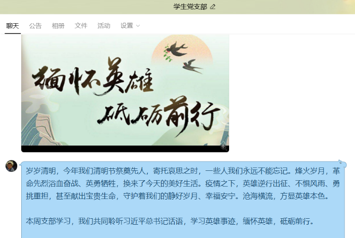 學(xué)生黨支部組織支部黨員共同聆聽(tīng)習(xí)近平總書記話語(yǔ),學(xué)習(xí)防疫期間涌現(xiàn)的英雄事跡,緬懷英雄,砥礪前行。黨員們認(rèn)為當(dāng)疫情形勢(shì)持續(xù)向好,當(dāng)武漢終于迎來(lái)“重啟”,熬過(guò)這段艱難時(shí)光的我們,更要記住這些為國(guó)為民付出生命的人。支部黨員結(jié)合給全系34個(gè)班級(jí)的主題班會(huì)課,指導(dǎo)學(xué)生開(kāi)展“網(wǎng)上祭英烈,防疫思英雄”系列活動(dòng)。
