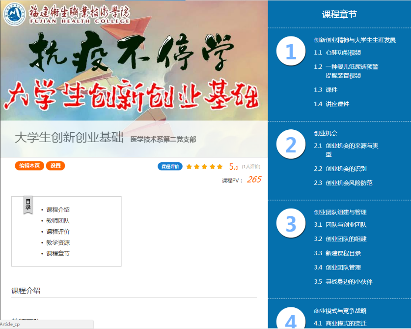 訓(xùn)練營(yíng)第二招:建網(wǎng)課,雙創(chuàng)知識(shí)學(xué)起來(lái)。醫(yī)學(xué)技術(shù)系第二黨支部在超星學(xué)習(xí)通平臺(tái)開(kāi)設(shè)《大學(xué)生創(chuàng)新創(chuàng)業(yè)基礎(chǔ)》在線課程,共上線16學(xué)時(shí)課程,內(nèi)容涵蓋創(chuàng)新創(chuàng)業(yè)精神、創(chuàng)業(yè)機(jī)會(huì)、創(chuàng)業(yè)團(tuán)隊(duì)組建于管理、創(chuàng)業(yè)計(jì)劃書的書寫技巧等,有助于引導(dǎo)學(xué)生增加創(chuàng)新創(chuàng)業(yè)基礎(chǔ)知識(shí)儲(chǔ)備。共有33位同學(xué)作為參賽梯隊(duì)隊(duì)員,參與了首批次的網(wǎng)絡(luò)學(xué)習(xí)。