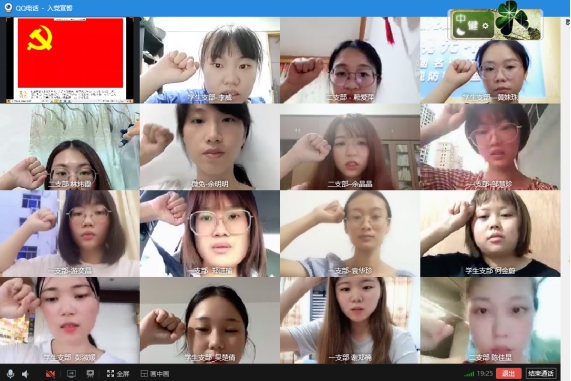 入黨宣誓儀式伊始,全體黨員起立,線上共同唱響了莊嚴(yán)的國(guó)際歌。隨后,方新榮老師宣讀了參加本次入黨宣誓儀式的19名新黨員名單。在第二黨支部書記鐘偉雄老師的帶領(lǐng)下,謝鄭楠19名新入黨的預(yù)備黨員在“云端”面向黨旗,舉起右手,莊嚴(yán)宣誓,表達(dá)對(duì)黨的忠誠(chéng)、為共產(chǎn)主義事業(yè)奮斗終身的決心。