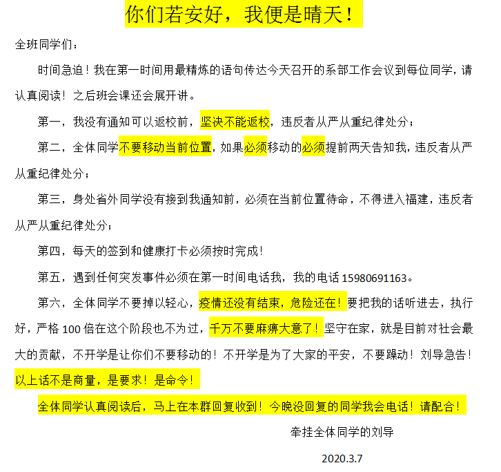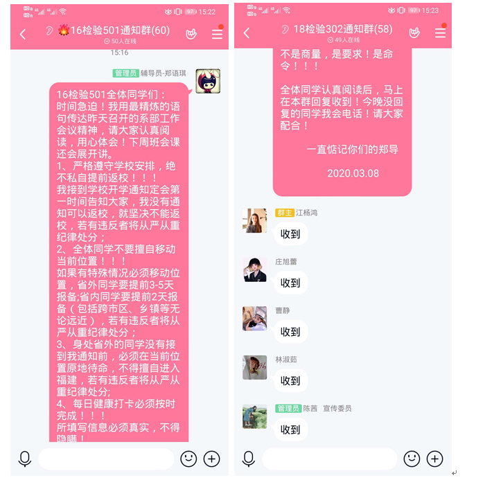 會后,各教研室主任及全體輔導員分別利用QQ、微信等網絡平臺,向全系1500余名師生傳達了會議精神師生們圍繞會議內容積極分享心得體會。輔導員陳念文老師指出面對突如其來的新型冠狀病毒感染的肺炎疫情,作為輔導員和學生工作一線管理員,“抗疫”時刻,雖不能成為“最美逆行者”,也要用自己扎實細致地工作,做好學生安全的“守門人”!”學生代表17檢驗304班謝溫潔同學表示作為醫(yī)學生,應當向在一線奮戰(zhàn)的醫(yī)護人員學習無私奉獻的精神,提高防疫知識、專業(yè)知識水平。同時保護好自己,注意個人衛(wèi)生,減少出行次數,提醒家人減少不必要的聚會,絕不提前返校返崗不為國家添亂!