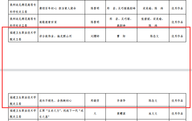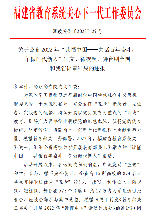 近日,福建省教育系統(tǒng)關(guān)工委公布了2022年“讀懂中國(guó)”活動(dòng)評(píng)審結(jié)果。本次省教育關(guān)工委共評(píng)選最佳征文10篇,優(yōu)秀征文47篇,最佳微視頻6個(gè),優(yōu)秀微視頻20個(gè)。我系選送的微視頻《人生應(yīng)該這樣度過(guò)》獲評(píng)福建省教育關(guān)工委2022年“讀懂中國(guó)”活動(dòng)微視頻最佳作品;選送的3篇征文均獲佳績(jī),征文《他種下一顆種子,后來(lái)碩果累累》獲評(píng)最佳作品,《講臺(tái)載偉業(yè),燭光照山河》《退休不褪色,余熱映初心》兩篇征文獲評(píng)優(yōu)秀作品。
