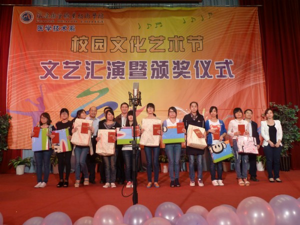 一場簡短而熱烈的文化藝術(shù)節(jié)系列活動(dòng)頒獎(jiǎng)典禮拉開了本次晚會(huì)的帷幕。首先由醫(yī)學(xué)技術(shù)系郭禮堅(jiān)副書記宣讀表彰決定;接著,馬少寧主任、江真君經(jīng)理相繼講話;最后,黃開良副院長進(jìn)行講話,對(duì)同學(xué)們給予肯定,并提出殷切希望。頒獎(jiǎng)典禮在喜悅、和諧的氣氛中閉幕。