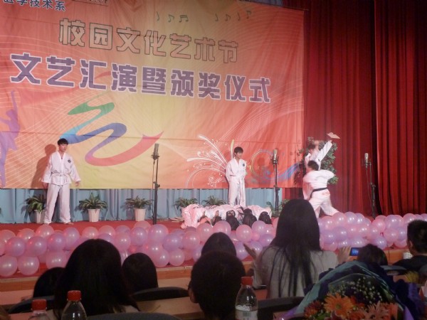 隨后,一場青春洋溢的健美操正式拉開文藝匯演序幕。11營養(yǎng)301班帶來的小品令全場捧腹大笑,12影像301及12放療301班同學(xué)們曼妙的舞姿,動(dòng)感的音樂伴奏贏得了臺(tái)下觀眾的陣陣喝彩。相聲、小品、跆拳道表演及詩朗誦等節(jié)目也不甘示弱,將晚會(huì)推向一個(gè)又一個(gè)高潮。一段代表醫(yī)學(xué)技術(shù)系全體師生感謝洪聿榮書記六年辛勤付出的VCR將晚會(huì)的氣氛推向最高峰。最后,晚會(huì)在全體演員的大合唱中落下帷幕。