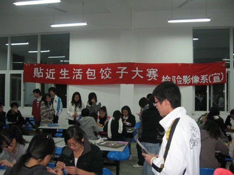 為給同學(xué)們提供一個(gè)互相交流、娛樂(lè)的平臺(tái),進(jìn)一步增進(jìn)同學(xué)們的感情,增強(qiáng)班級(jí)凝聚力,檢驗(yàn)影像系于11月19日晚上7:30在明湖餐廳舉辦了“貼近生活”的包餃子比賽。各班選派5位同學(xué)參加,輔導(dǎo)員和學(xué)生會(huì)干部擔(dān)任這次比賽評(píng)委。