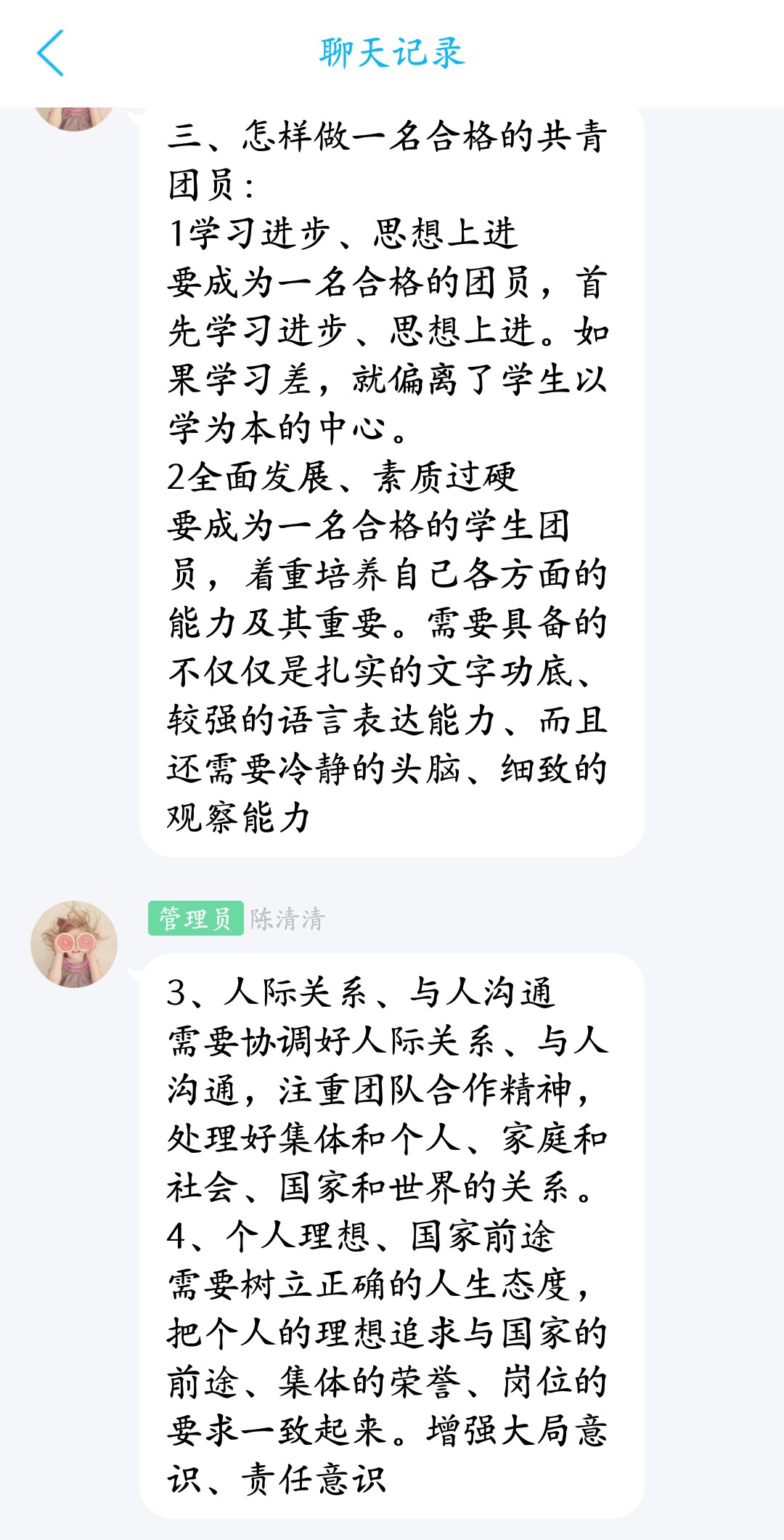 首先,陳清清老師帶領同學們認識共青團,她表示作為一名光榮的團員,應該嚴于律己,不斷的增強個人團員意識,用實際行動展現(xiàn)當代青年的時代性與先進性,絕不能讓胸前的團徽褪色。進而從樹立知團史曉團情意識、自立自強意識、自律慎獨意識、社會競爭意識、創(chuàng)新發(fā)展意識五個方面講述做一名合格團員所應該樹立的意識。
