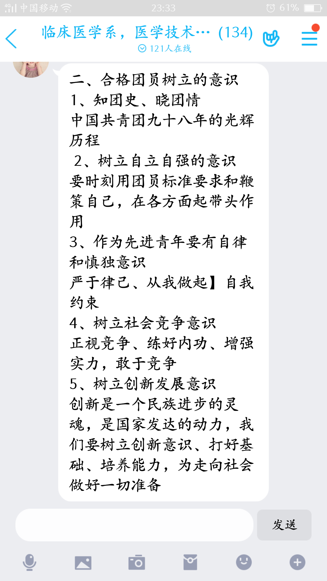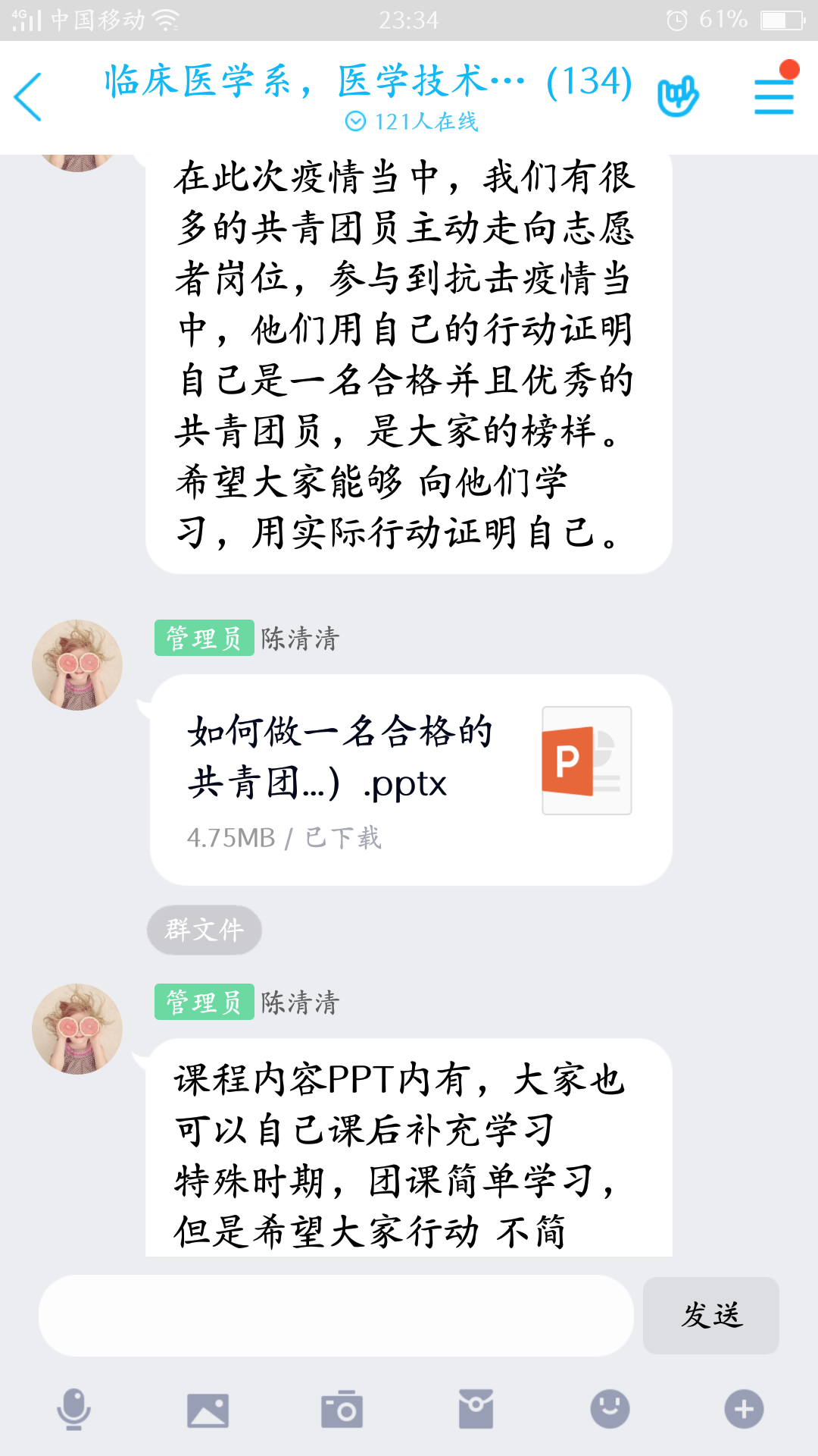 2020312日晚上,醫(yī)學技術系、臨床醫(yī)學系通過QQ平臺進行線上“醫(yī)學技術系第十期、臨床醫(yī)學系第十一期業(yè)余分團?!钡谌n。臨床醫(yī)學系團總支書記陳清清老師以“如何做一名合格的共青團員”為主題進行授課。此次團課圍繞“對共青團的認識”、“做一名合格團員應該樹立的意識”、“怎樣做一名合格的共青團員”三個部分展開。