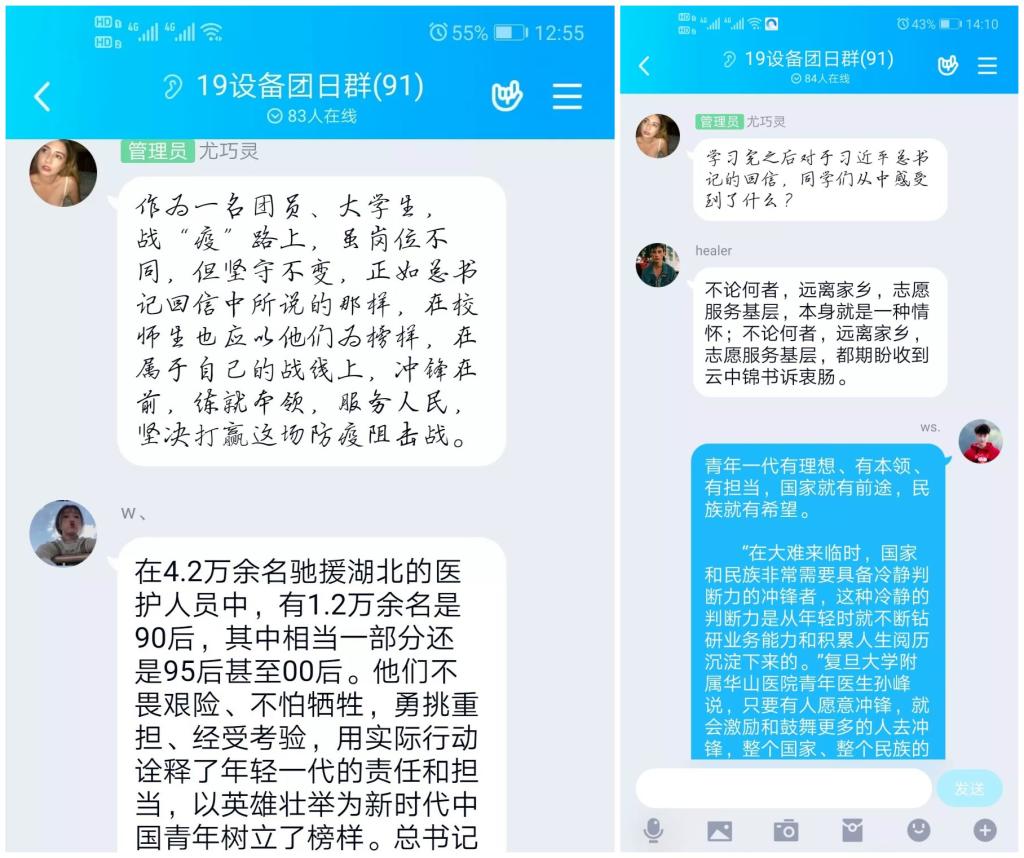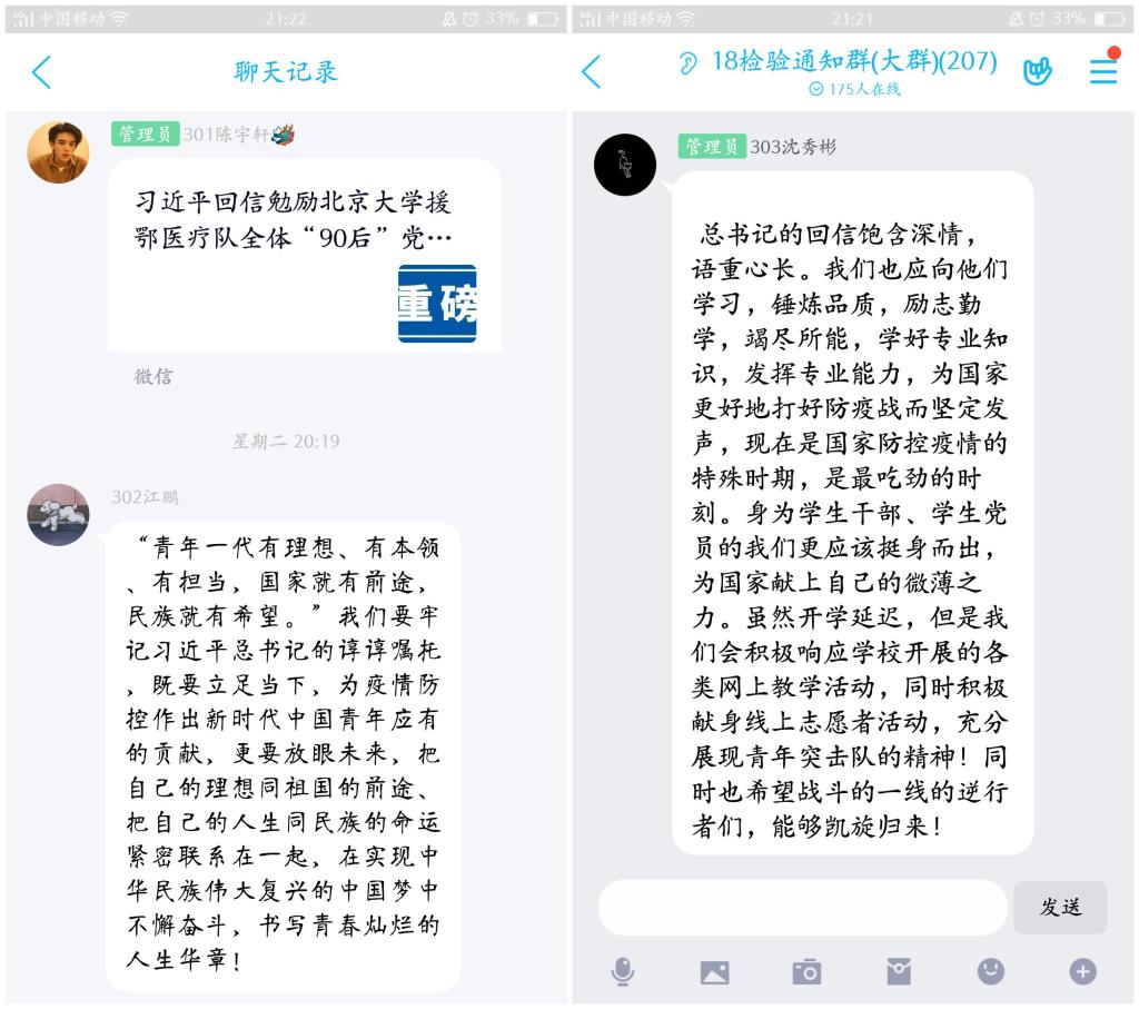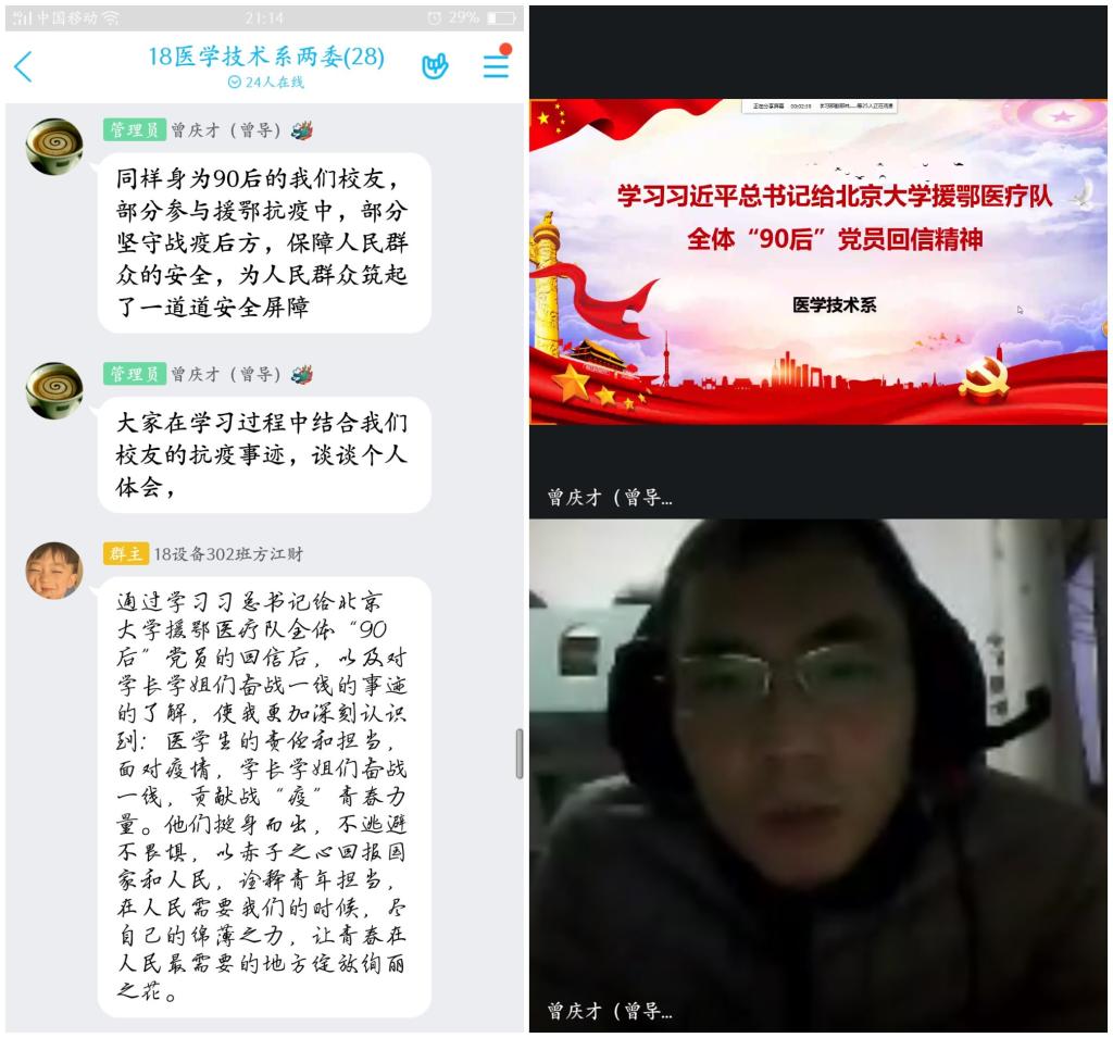 2020315日,習近平總書記給北京大學(xué)援鄂醫(yī)療隊全體“90后”黨員回信。為了深入學(xué)習習近平總書記回信精神,教育同學(xué)奮斗青春,書寫人生絢麗篇章,發(fā)揚愛國主義精神,我系團總支書記曾慶才老師主持召開學(xué)生干部線上會議,各團支部于317日在線上開展以“平‘語’近人,激勵青春為主題的特別團日活動。