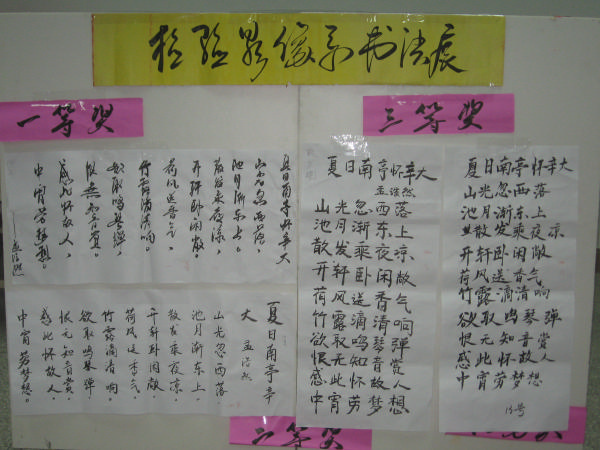 為豐富同學(xué)們的課余活動,提高對中國書法的鑒賞能力,同時發(fā)掘系部書法方面的優(yōu)秀人才,檢驗影像系于2007年10月11日下午4:00在系二階舉行書法比賽。本次比賽共收到參賽作品50余件,其參賽作品之多,書法技藝之高超,令評委驚喜。經(jīng)過評委的認(rèn)真評選,最終選出一等獎2名,二等獎4名,三等獎6名,優(yōu)秀獎8名,而所有獲獎?wù)叨紝@得相應(yīng)的素質(zhì)拓展加分。