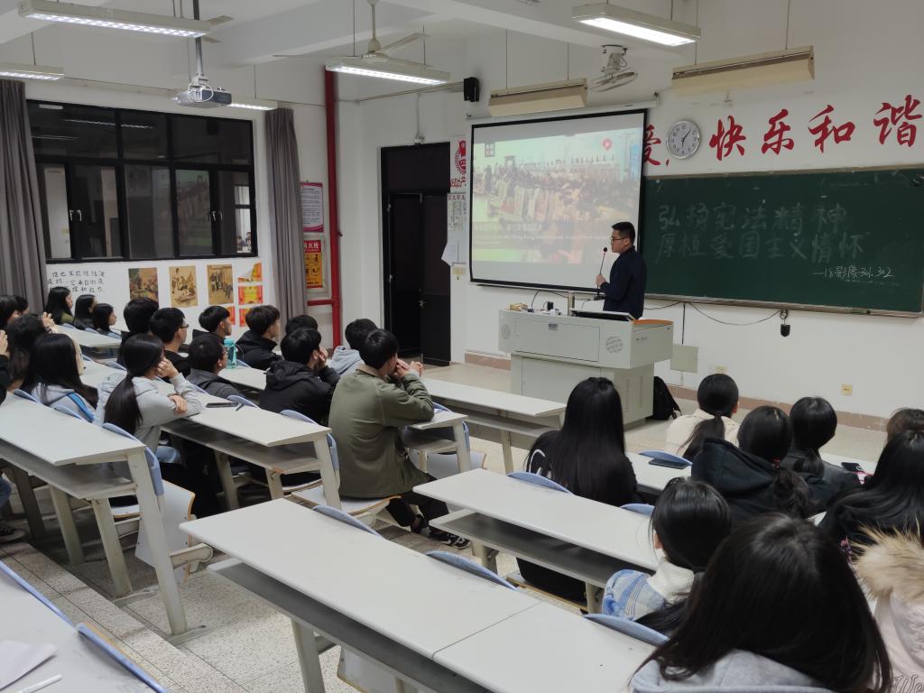 不同以往,此次主題班會特別邀請了上海錦天城(福州)律師事務所的湯少彬律師為同學講授憲法的知識,湯律師通過一個個發(fā)生在身邊的真實故事,生動地講解什么是憲法、憲法的作用、憲法能帶來什么好處以及憲法與愛國精神的關系等內容。同學們認真專注聽講,湯律師生動詼諧的語言不時引起全場的掌聲,取得很大的反響。