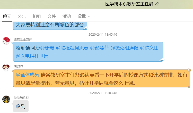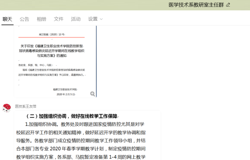 按照“推遲開(kāi)學(xué)不停學(xué)”的原則,各教研室主任積極開(kāi)展本學(xué)期教學(xué)工作安排,通過(guò)各教研室網(wǎng)絡(luò)群組織做好開(kāi)展在線(xiàn)教學(xué)和在線(xiàn)輔導(dǎo)的準(zhǔn)備工作