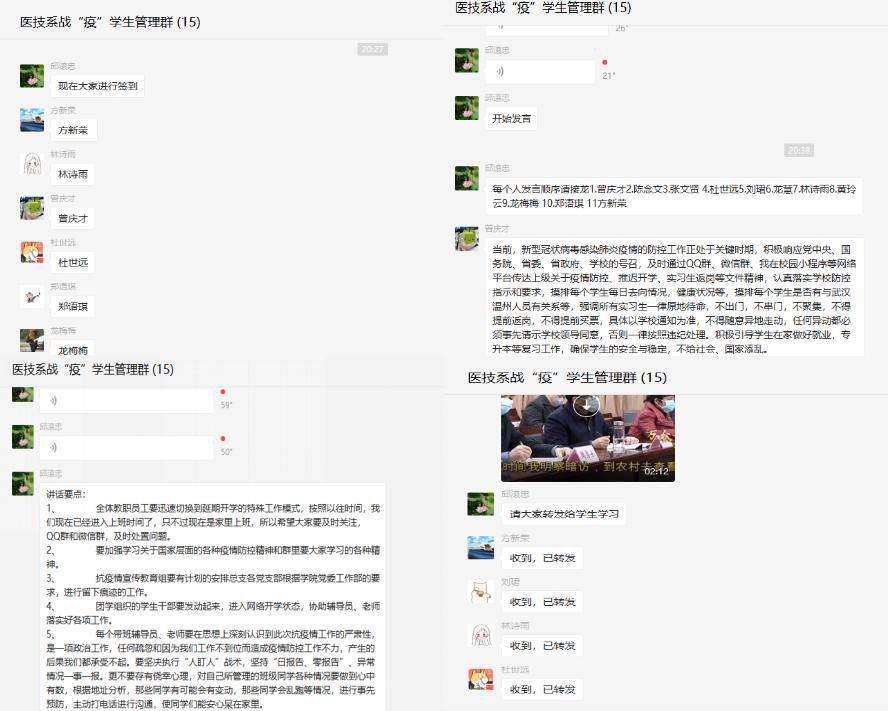 醫(yī)學(xué)技術(shù)系防控工作領(lǐng)導(dǎo)小組及時(shí)傳達(dá)和學(xué)習(xí)有關(guān)通知精神,研究制定《醫(yī)學(xué)技術(shù)系防范新型冠狀病毒應(yīng)急預(yù)案》,每日通報(bào)系部師生健康情況。