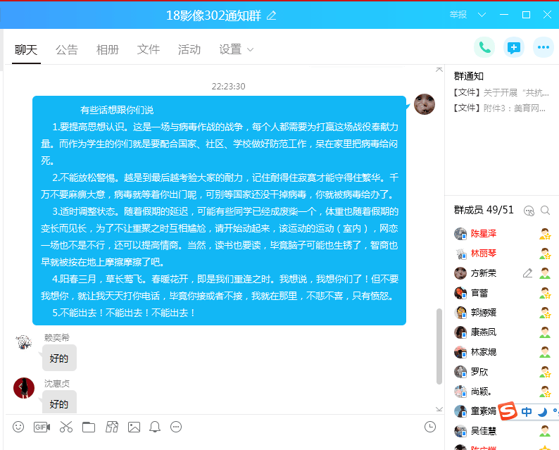 各班級(jí)同學(xué)開(kāi)展了主題網(wǎng)絡(luò)班會(huì),一起學(xué)習(xí)了解戰(zhàn)“疫”大形勢(shì),進(jìn)行科普知識(shí),討論如何樹(shù)立健康心態(tài),合理安排假期學(xué)習(xí)和生活,號(hào)召大家做助力員、宣傳員、示范員,助力戰(zhàn)“疫”。有的班級(jí)還制作了祝福視頻,為打贏疫情防控阻擊戰(zhàn)加油鼓勁。