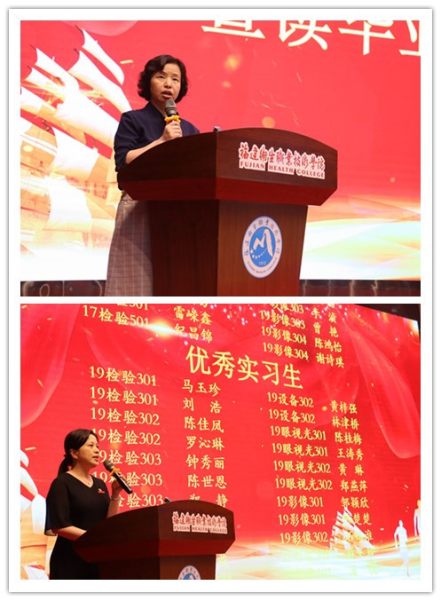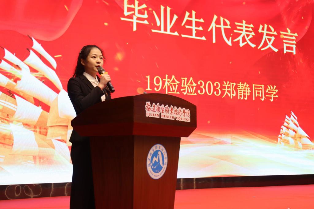 19檢驗(yàn)303班鄭靜同學(xué)作為畢業(yè)生代表發(fā)言,她深情回憶了在閩衛(wèi)院的美好時(shí)光,抒發(fā)了對母校和恩師的感恩和不舍,表達(dá)了醫(yī)技學(xué)子奔赴一線基層,以實(shí)干奮斗服務(wù)健康中國的豪情壯志。