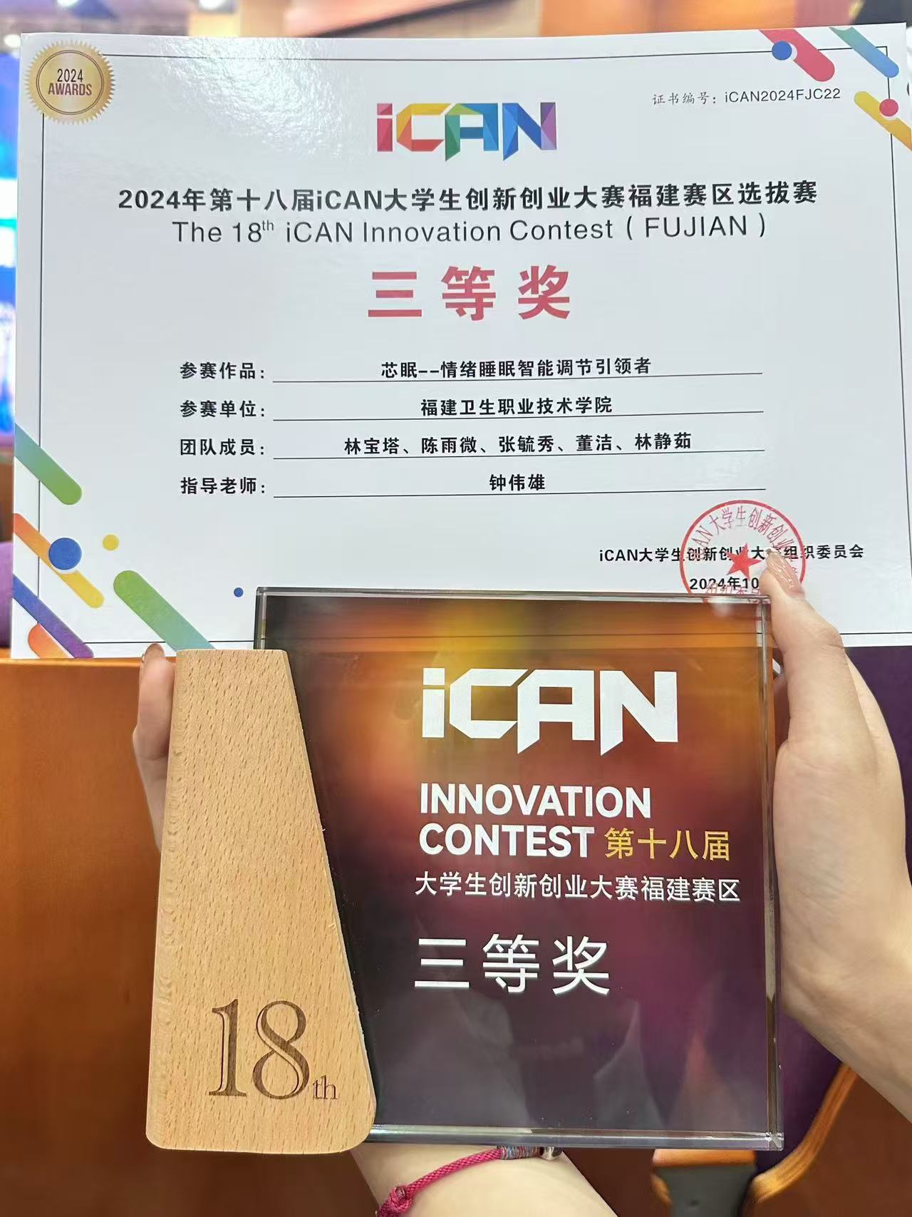20241019日,第十八屆iCAN大學(xué)生創(chuàng)新創(chuàng)業(yè)大賽福建賽區(qū)選拔賽在福州大學(xué)至誠學(xué)院圓滿落幕。我校報送的參賽項目《芯眠-情緒睡眠智能調(diào)節(jié)引領(lǐng)者》項目獲得三等獎。這是我校首次在該項賽事獲獎。