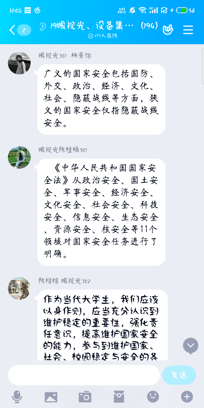 2020415日是第5個(gè)全民國(guó)家安全教育日。習(xí)近平總書(shū)記強(qiáng)調(diào),實(shí)現(xiàn)中華民族偉大復(fù)興的中國(guó)夢(mèng),保證人民安居樂(lè)業(yè),國(guó)家安全是頭等大事。為此,醫(yī)學(xué)技術(shù)系各團(tuán)支部于414日通過(guò)QQ平臺(tái)舉行線上增強(qiáng)國(guó)家安全意識(shí),共同維護(hù)國(guó)家安全主題團(tuán)日活動(dòng)。