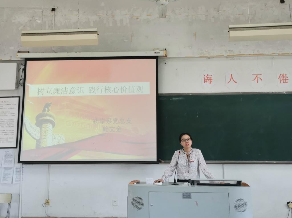 2019年10月22日,藥學(xué)系黨總支副書記賴文金在藥二階為第二十二期業(yè)余分黨校的學(xué)員們講授了主題為“樹立大學(xué)生廉潔自律意識,踐行社會主義核心價值觀”的講座。