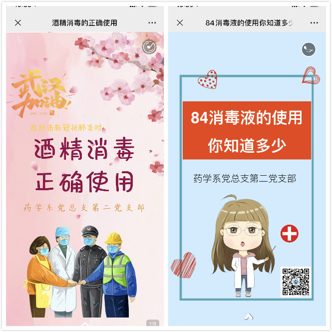 新型冠狀病毒突襲中國(guó),我院的疫情防控工作全面展開(kāi),正當(dāng)大家投身防疫工作之際,一個(gè)精美H5——“新冠肺炎中藥預(yù)防小知識(shí)”現(xiàn)身我院公眾號(hào),如何認(rèn)識(shí)新冠、如何用中藥防范新冠,如何正確戴口罩與洗手,這一個(gè)個(gè)實(shí)用的小知識(shí)為師生們的自我防護(hù)提供了專(zhuān)業(yè)指導(dǎo)。隨后,一個(gè)個(gè)宣傳防疫知識(shí)的H5如雨后春筍般此起彼伏,或宣傳84消毒液與酒精的正確使用,或宣傳辦公場(chǎng)所、學(xué)生群體的防護(hù)知識(shí)、或宣傳中醫(yī)對(duì)新冠的辨證診療與方劑使用、或倡導(dǎo)咳嗽、打噴嚏的文明禮節(jié)……這些貼近實(shí)際、實(shí)用性強(qiáng)、制作精美,受到師生喜愛(ài)的H5目前已有12個(gè),后續(xù)還將繼續(xù)增加,而這些H5均來(lái)自于藥學(xué)系的兩個(gè)教師黨支部。