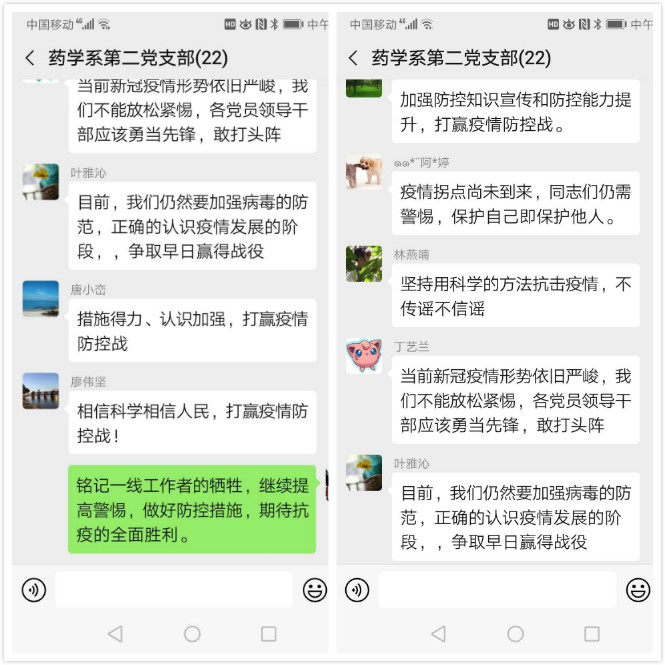 隨后,支部黨員結合個人工作實際展開發(fā)言。大家紛紛表示要致敬前線醫(yī)療行業(yè)的勇士們,牢記入黨誓詞,充分發(fā)揮黨員的先鋒模范作用,立足本職崗位,積極參與院系疫情防控工作,做到不負初心,不負誓言!