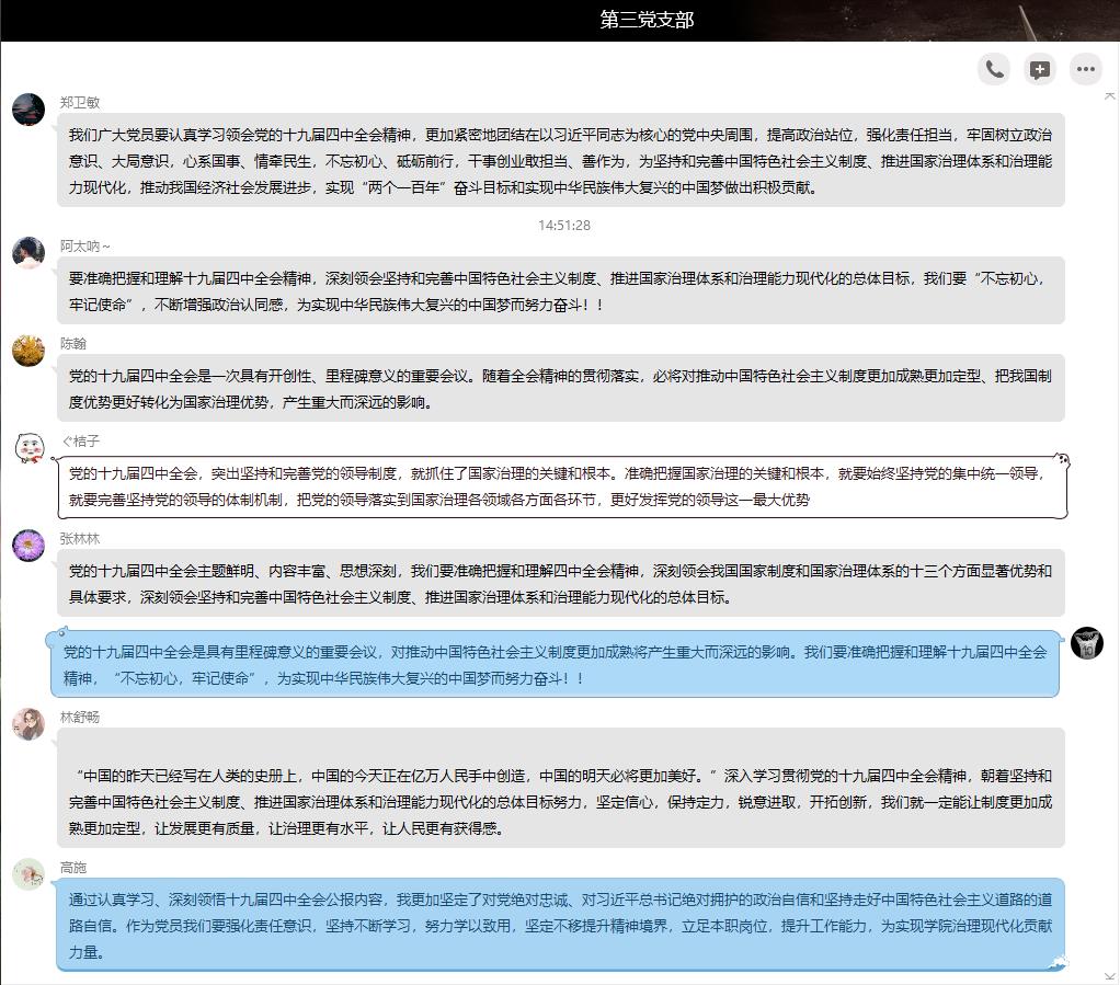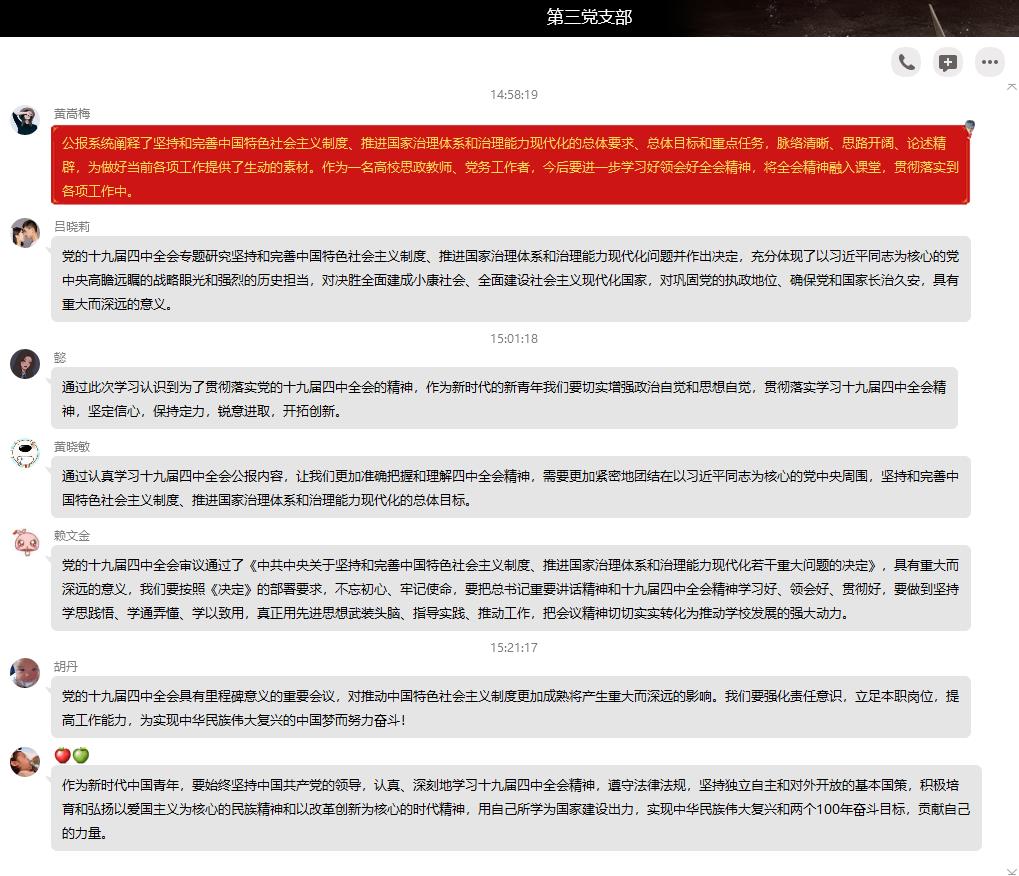 通過本次集中學(xué)習(xí),支部全體黨員的思想覺悟再一次接受洗禮,全體師生黨員紛紛表示,作為黨務(wù)工作者、思政教師、學(xué)生代表,定將按照《決定》的部署要求,不忘初心、牢記使命,把全會精神、《決定》精神學(xué)習(xí)好、領(lǐng)會好、貫徹好,堅持學(xué)思踐悟、學(xué)通弄懂、學(xué)以致用,真正用先進思想武裝頭腦、指導(dǎo)實踐、推動學(xué)習(xí)工作,為國家治理體系和治理能力現(xiàn)代化建設(shè)貢獻力量。