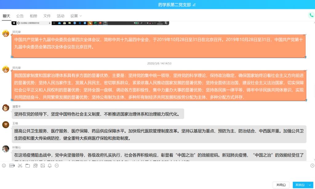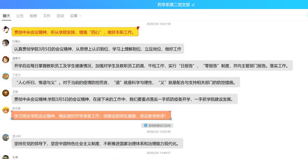 2020年3月6日,藥學(xué)系第二黨支部支部通過(guò)微信群開(kāi)展線(xiàn)上專(zhuān)題學(xué)習(xí)活動(dòng),學(xué)習(xí)傳達(dá)學(xué)院疫情防控工作領(lǐng)導(dǎo)小組第六次會(huì)議暨黨委中心組學(xué)習(xí)擴(kuò)大會(huì)議精神。