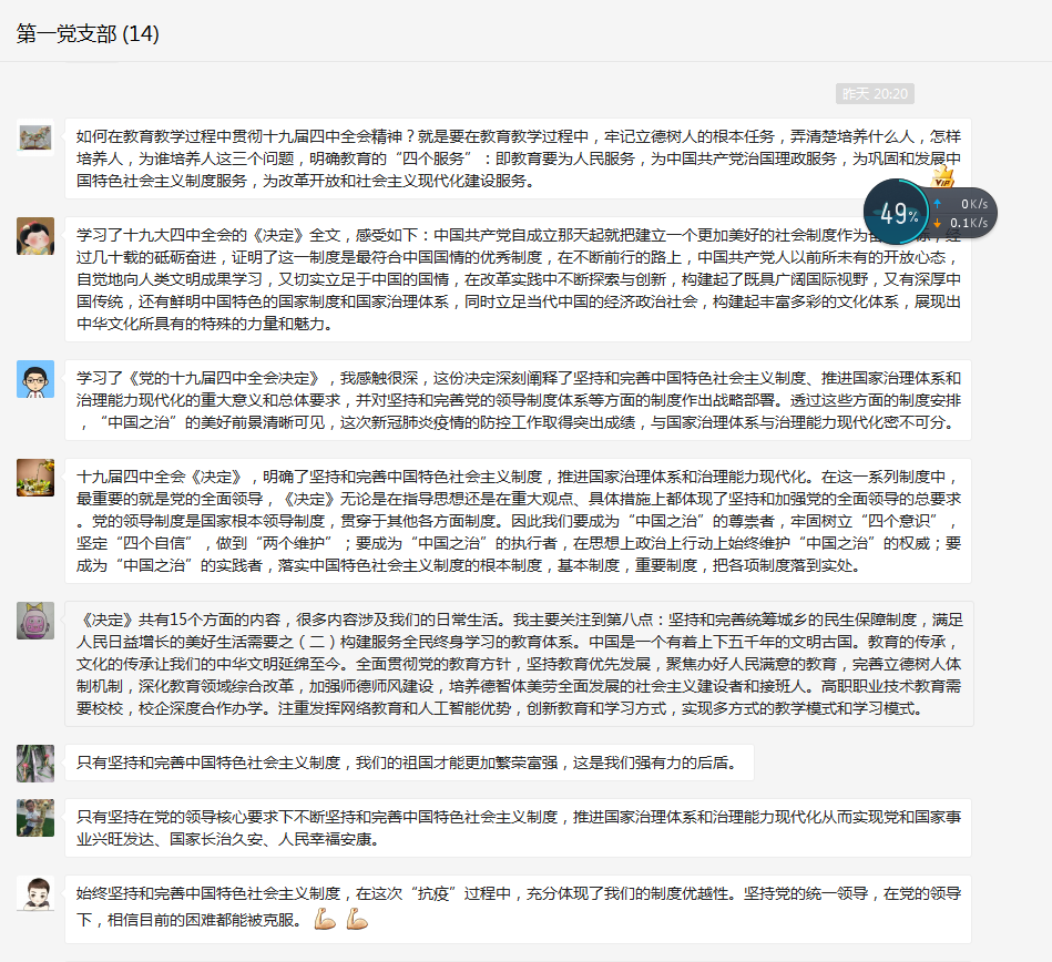 3月14日,為保證黨員組織生活不斷線,藥學(xué)系第一黨支部堅(jiān)持通過微信開展“我學(xué)黨的十九屆四中全會(huì)”線上主題黨日活動(dòng),集中學(xué)習(xí)黨的十九屆四中全會(huì)精神。