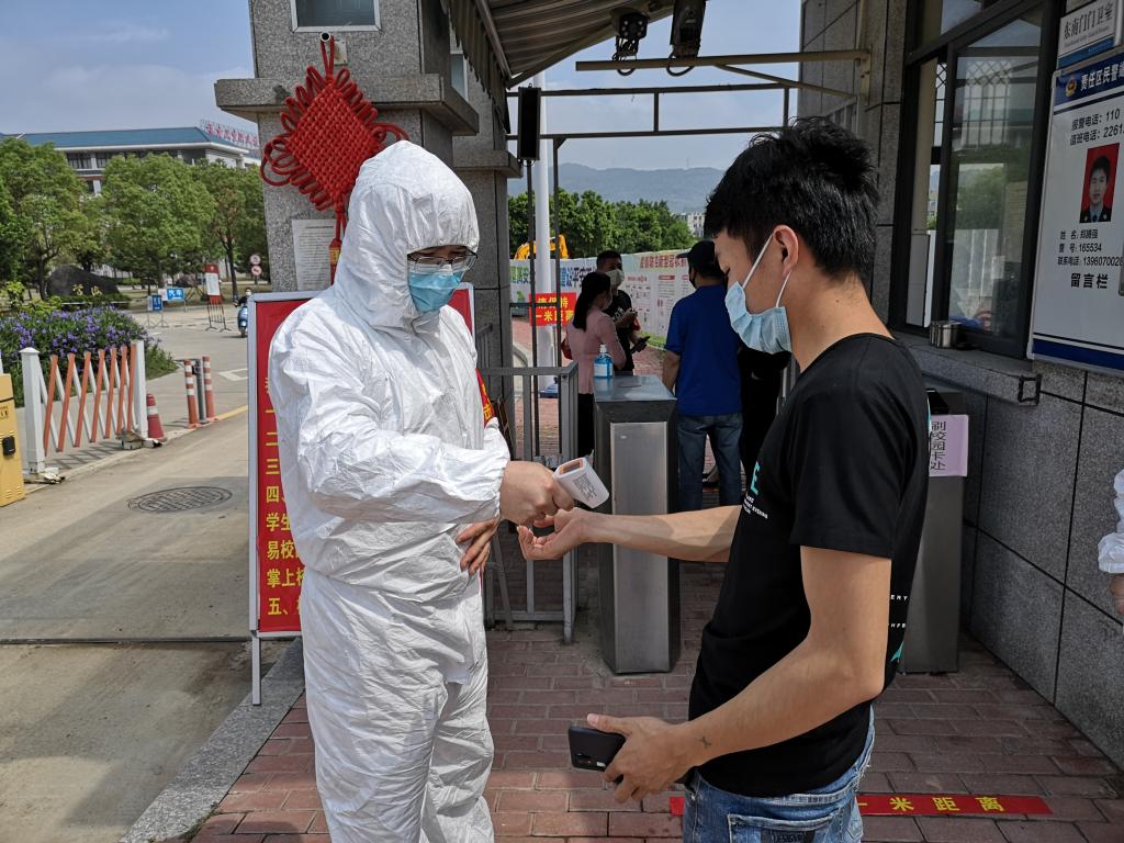 鄧元榮老師對入校學(xué)生進(jìn)行體溫監(jiān)測