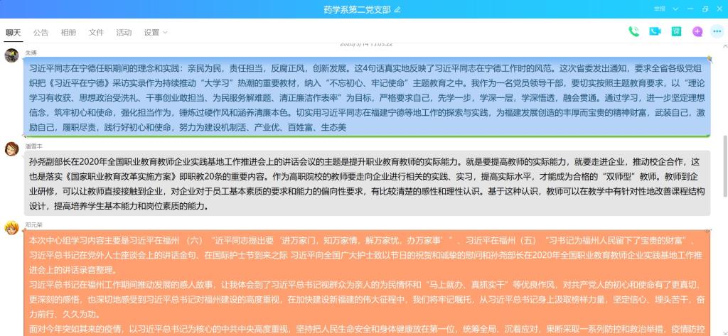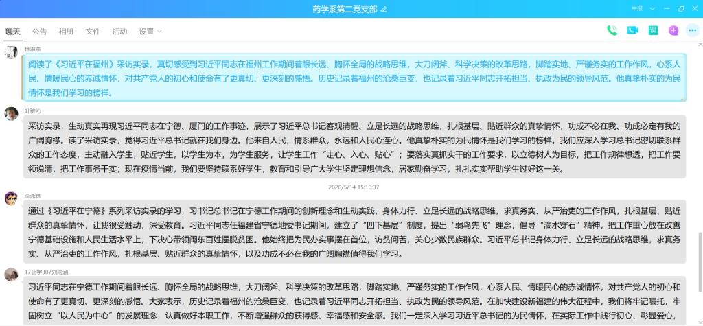 2020年5月15日,藥學(xué)系第二黨支部開展線上專題學(xué)習(xí)活動(dòng),全體黨員集中學(xué)習(xí)《習(xí)近平在廈門》、《習(xí)近平在寧德》兩部采訪實(shí)錄部分選篇 。本次專題學(xué)習(xí)由支部書記鄧元榮同志主持。
