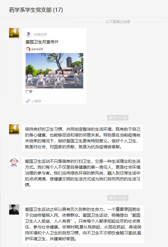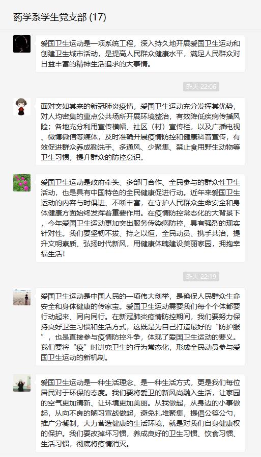 愛(ài)國(guó)衛(wèi)生人人受益,疫情防控人人有責(zé)。6月16日,藥學(xué)系學(xué)生黨支部通過(guò)微信平臺(tái),觀看“愛(ài)國(guó)衛(wèi)生月宣傳片”,集中學(xué)習(xí)愛(ài)國(guó)衛(wèi)生運(yùn)動(dòng)精神。