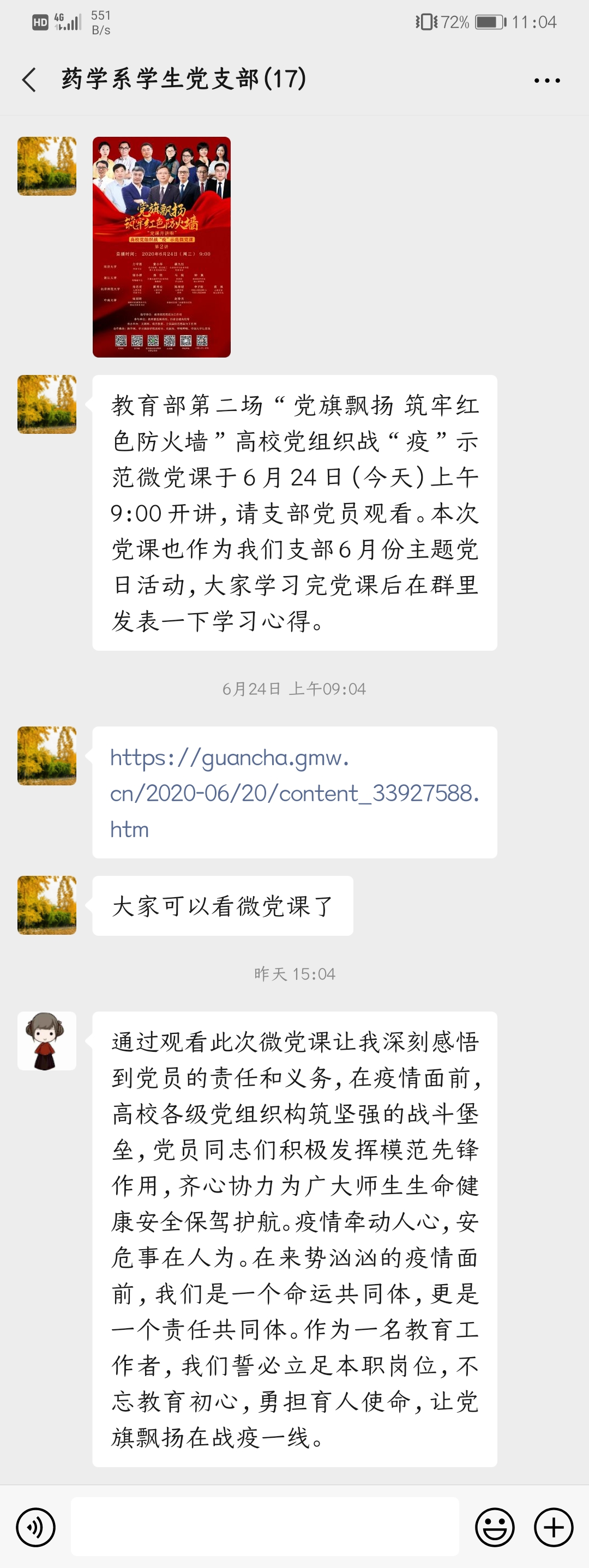 6月24日,藥學(xué)系學(xué)生黨支部通過網(wǎng)絡(luò)平臺,開展主題黨日活動,集中觀看教育部“黨旗飄揚,筑牢紅色防火墻”高校黨組織戰(zhàn)“疫”示范微黨課。