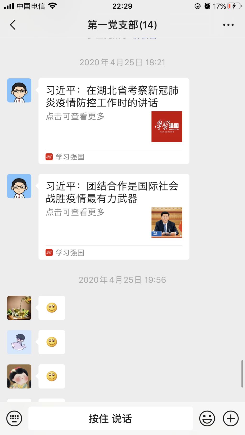 4月25日,藥學(xué)系第一黨支部通過微信平臺,集中學(xué)習(xí)“習(xí)近平在湖北省考察新冠肺炎疫情防控工作時(shí)的講話”、“習(xí)近平:團(tuán)結(jié)合作是國際社會戰(zhàn)勝疫情最有力武器”等內(nèi)容,活動由支部書記何舒瀾主持。