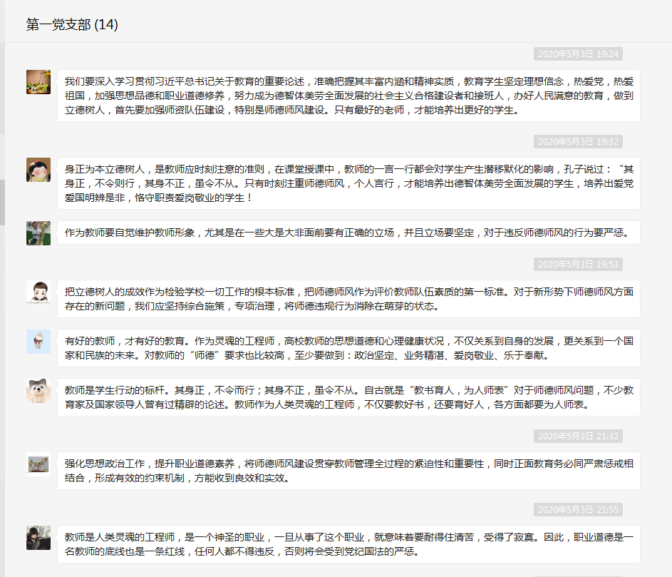 2020年5月3日,藥學(xué)系第一黨支部通過微信群在線開展師德師風(fēng)建設(shè)學(xué)習(xí)活動,本次支部活動恰逢五一小長假,黨員同志在休息的同時不忘學(xué)習(xí),認(rèn)真研讀了《加強師德建設(shè)當(dāng)堅持失責(zé)必問》、《教育部強調(diào)師德師風(fēng)第一標(biāo)準(zhǔn):嚴(yán)重違規(guī)者將終身禁教》兩篇文章。活動由支部書記何舒瀾主持。