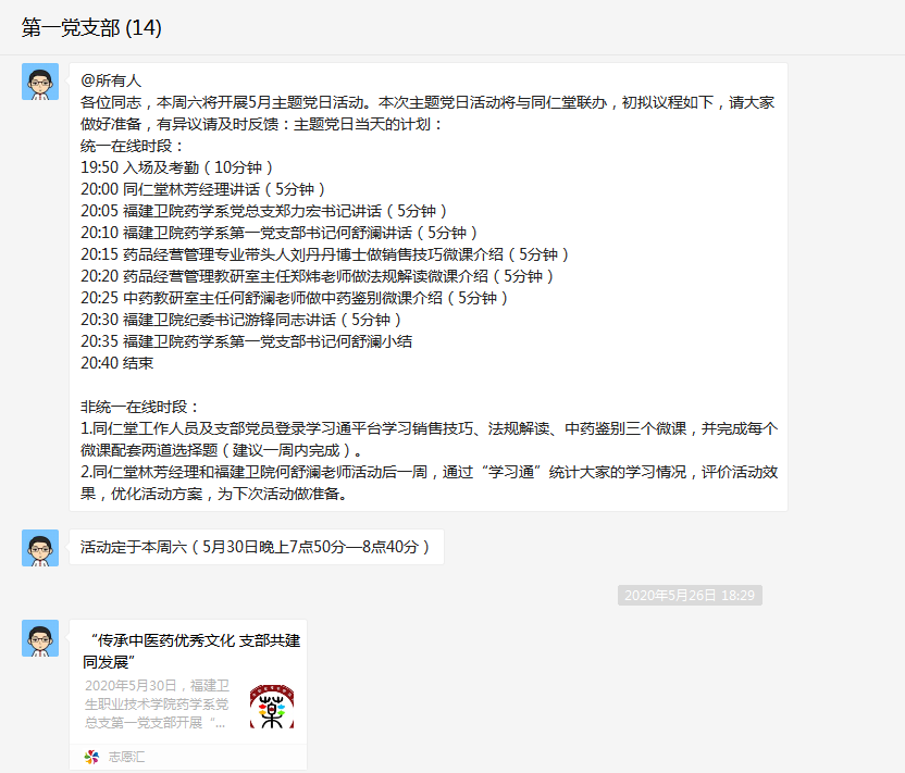 為更好弘揚(yáng)中醫(yī)藥傳統(tǒng)文化,增強(qiáng)黨員同志對(duì)中醫(yī)藥傳統(tǒng)文化的了解和認(rèn)同,5月30日,藥學(xué)系第一黨支部與北京同仁堂健康藥業(yè)連鎖有限公司支部黨員通過(guò)騰訊會(huì)議開展“傳承中醫(yī)藥傳統(tǒng)文化,支部共建同發(fā)展”主題黨日活動(dòng),校企黨員同志在線開展學(xué)習(xí)交流,活動(dòng)由支部書記何舒瀾主持。
