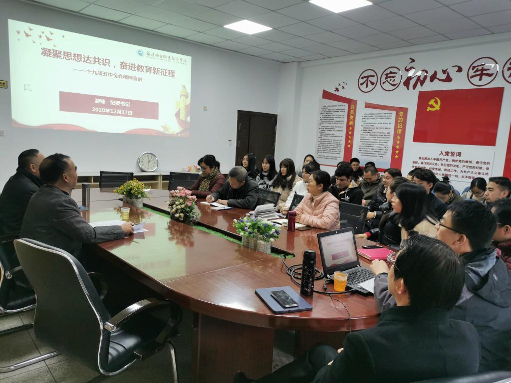 課上,游鋒首先回顧了十九屆五中全會會議內(nèi)容,并從“辦學規(guī)模和質(zhì)量不斷攀升、教學改革成效顯著、智慧校園基本成型、推進校內(nèi)外實訓基地建設(shè)”等四個方面詳細闡述了我校教育發(fā)展“十三五”期間取得的顯著成就,最后,立足學校實際,結(jié)合高水平職業(yè)院校建設(shè)十大工程重點解讀了學?!笆奈濉苯ㄔO(shè)發(fā)展計劃。